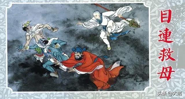 相传,释迦牟尼弟子目连尊者父母双亡,修道之前十分思念母亲,得道后,他开天眼通在地狱寻找自己的母亲。发现其母堕落饿鬼道中,食物入口,即化为烈焰,饥苦太甚。